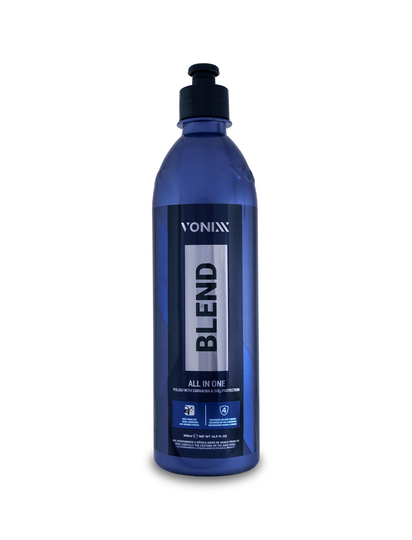 Blend All In One é um polidor de etapa única com proteção, que alia o brilho da carnaúba e a resistência cerâmica do SiO2, promovendo também hidrorrepelência na pintura. Seu alto poder de corte elimina riscos e swirls médios a severos (comparável a marcas de lixa P2000 ou mais finas), deixando um ótimo acabamento ao mesmo tempo.
